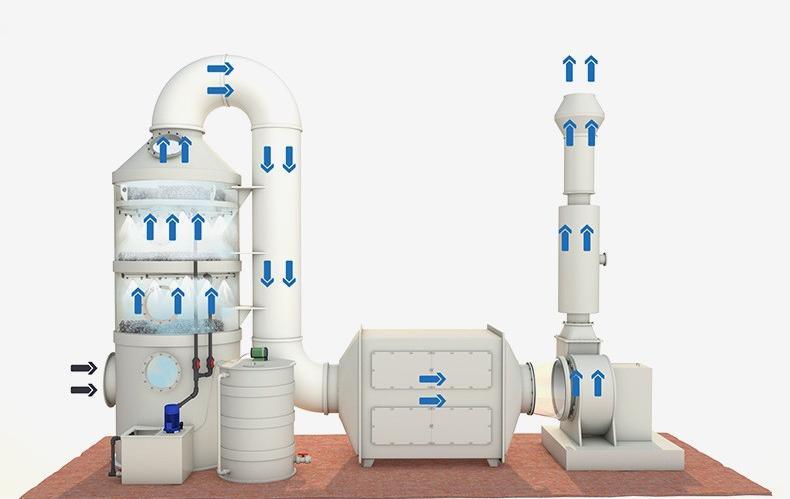 現(xiàn)將廢氣集中收集起來(lái),一般是用集氣罩,吸收過(guò)來(lái)的廢氣經(jīng)過(guò)噴淋塔,噴淋塔可以去除可溶于水的粉塵,去掉粉塵的廢氣在經(jīng)過(guò)活性炭吸附,除掉有機(jī)廢氣部分,然后在經(jīng)過(guò)UV光解除臭,排放出去的氣體則可以安全達(dá)標(biāo)排放。