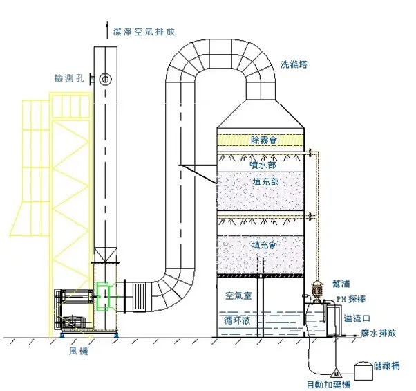 本設(shè)備擬布置在干燥操作室三樓平臺,業(yè)主干燥設(shè)備來源廢氣(溫度60℃-90℃)經(jīng)過集氣管路至濕式除塵塔濕式除塵設(shè)備,濕式除塵塔中設(shè)置預(yù)噴淋裝置用以除去廢氣中含有的高濃度粉塵,并具有降溫作用,預(yù)處理后的廢氣進入填料層。填料層中布置規(guī)格為φ50的鮑爾環(huán),上方噴淋水霧附著在鮑爾環(huán)上,增大了與廢氣的接觸面積,提高了廢氣中粉塵的去除效率。噴淋過后的水經(jīng)過重力作用匯集到下方的循環(huán)水箱中,在循環(huán)水泵的作用下,達到循環(huán)使用的目的,循環(huán)水箱底部設(shè)置排污接口,飽和廢水經(jīng)過排污管道排放至業(yè)主下水管道集中處理。處理后的廢氣經(jīng)過除霧層的二次處理,除去廢氣中的水霧后經(jīng)由抽引風(fēng)機排放z樓頂煙囪。本設(shè)備對于粉塵的處理效率為99%,處理后的廢氣滿足《北京市大氣污染綜合排放標準》DB11501-2017排放標準。