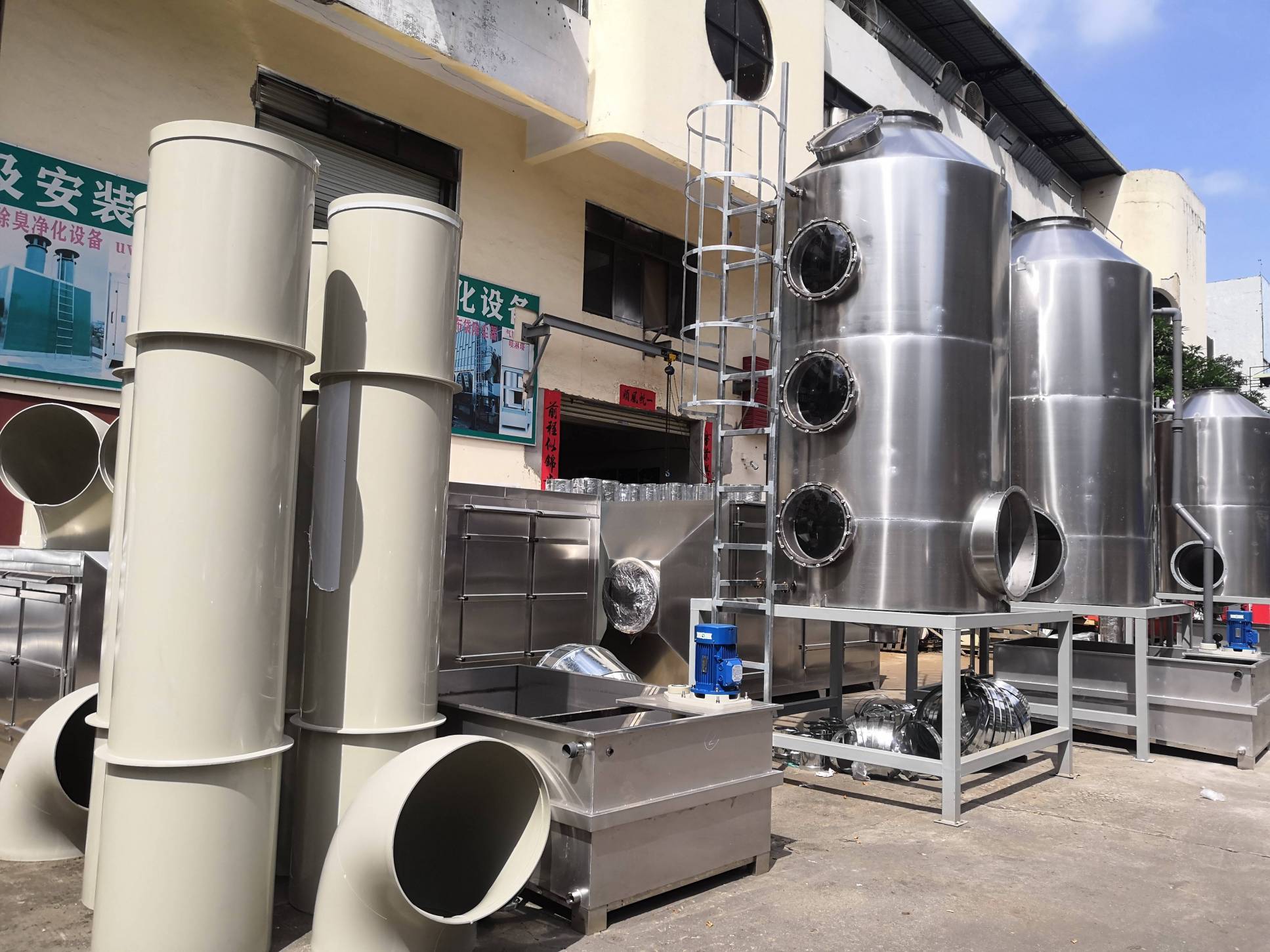 根據(jù)廢氣類型和場(chǎng)地需求我們采用噴淋塔+兩級(jí)活性炭對(duì)其進(jìn)行處理。反應(yīng)釜廢氣處理配套一臺(tái)17170風(fēng)量pp噴淋塔+兩臺(tái)17170風(fēng)量的不銹鋼材質(zhì)活性炭吸附塔+干式過(guò)濾與大功率防爆離心風(fēng)機(jī)+自動(dòng)化電控柜系統(tǒng)。