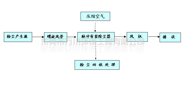 含塵廢氣在風(fēng)機作用下,通過風(fēng)管收集進入脈沖布袋除塵器,含塵廢氣進入中箱體下部,在擋風(fēng)板形成預(yù)分離室內(nèi),粉塵因慣性作用落入灰斗。廢氣沿?fù)躏L(fēng)板向上到達(dá)濾袋,粉塵被阻留在濾袋外面,干凈氣體進入袋內(nèi),并經(jīng)過袋口和上箱體及風(fēng)機再排出。